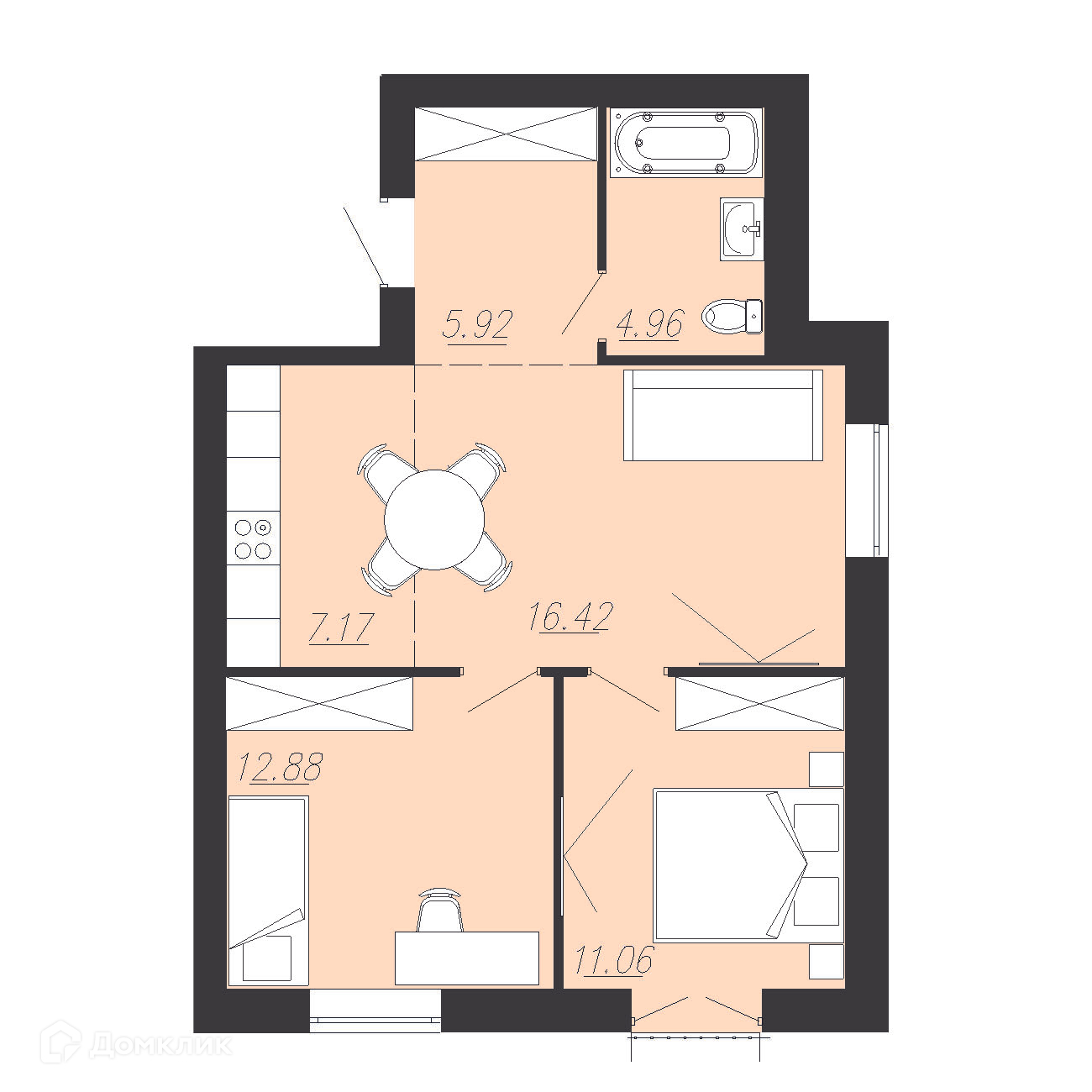 - ✅ Общая площадь: 58.4 м².