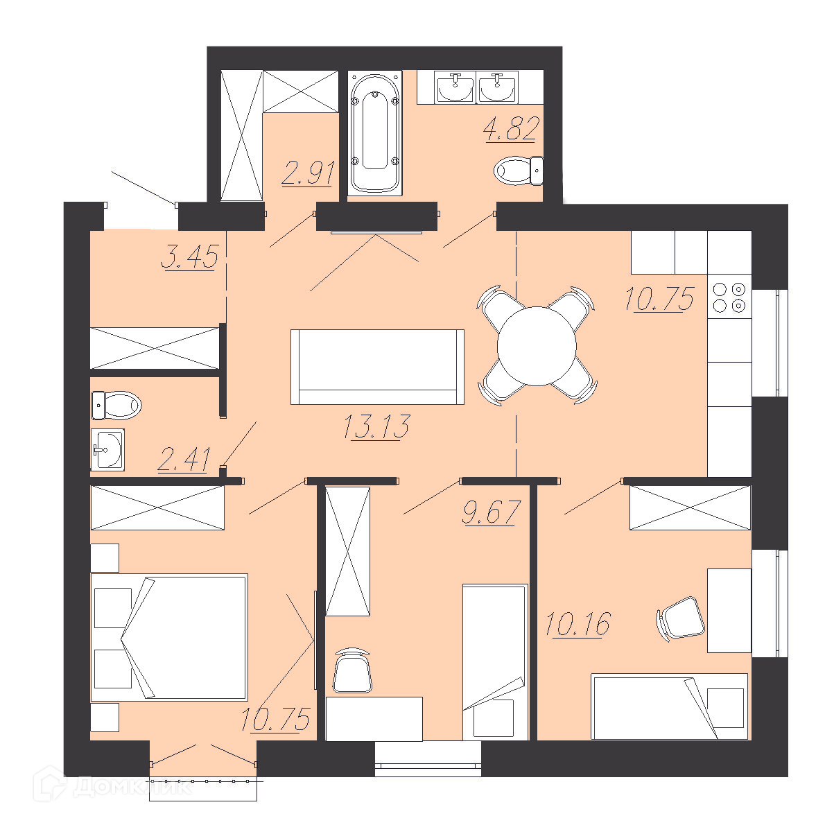 - ✅ Кухня: 23.88 м² — эргономичное пространство.