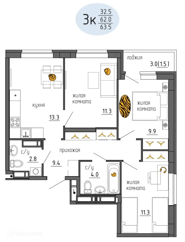 3 комн. квартира в Перьми в ипотеку от 62 432 руб/месяц