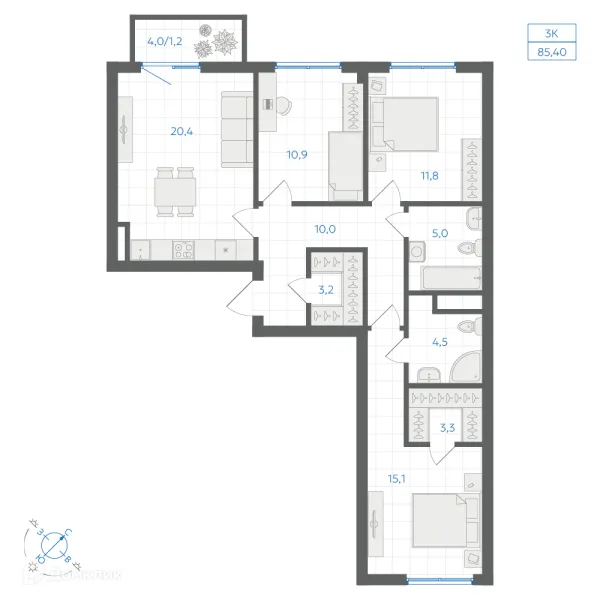 3 комн. квартира в Челябинске в ипотеку от 104 054 руб/месяц