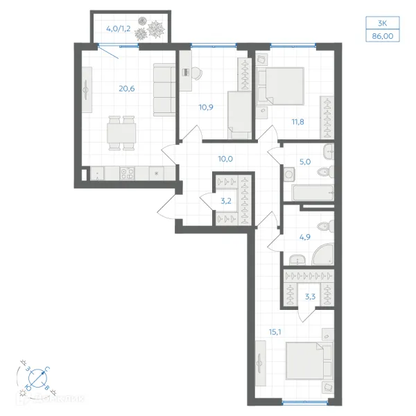 3 комн. квартира в Челябинске в ипотеку от 99 586 руб/месяц