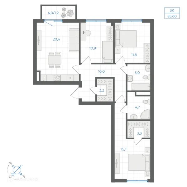 3 комн. квартира в Челябинске в ипотеку от 85 648 руб/месяц